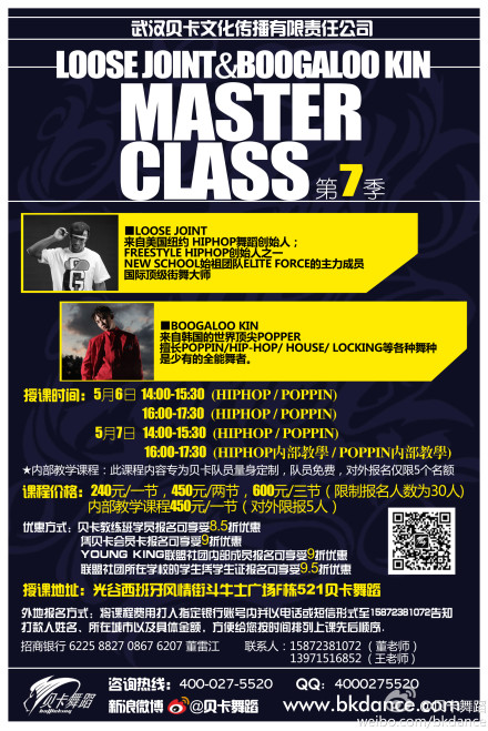 貝卡大師授課第7季火爆登場(chǎng):這次邀請的是HIPHOP舞蹈創(chuàng )始人Loose Joint與世界頂尖POPPER Boogaloo Kin,除了經(jīng)典舞步和舞蹈技術(shù)連接運用的教學(xué)外,還有課堂答疑、與大師共舞等交流環(huán)節,為了確保上課質(zhì)量,限報30人。